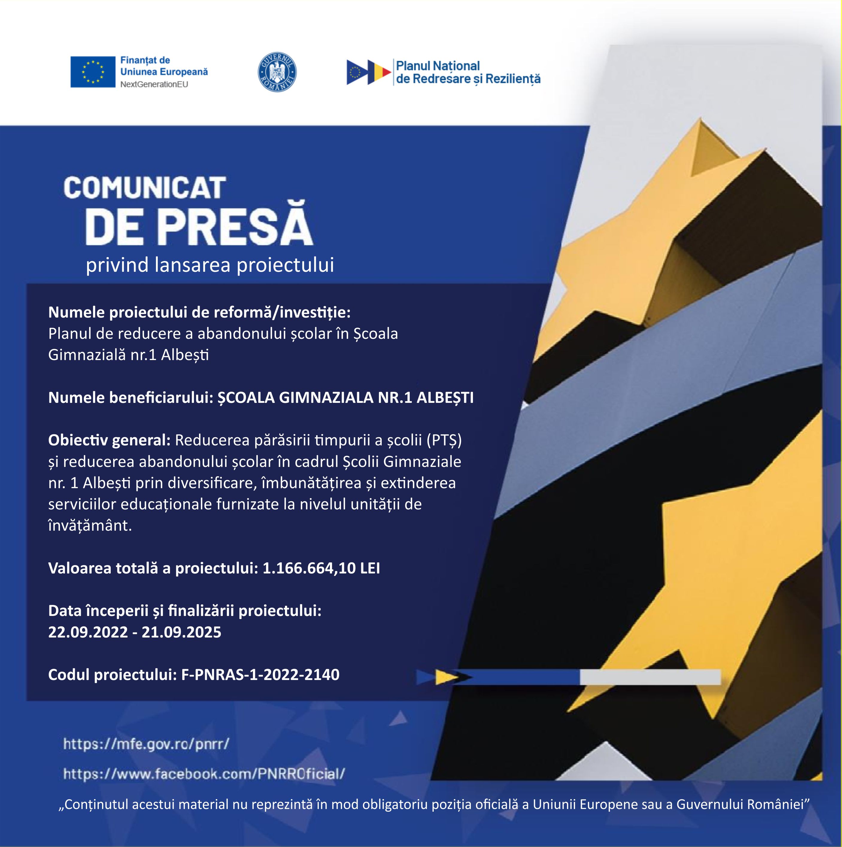 Planul de reducere a abandonului școlar în Școala Gimnazială nr.1 Albești, Cod final de înregistrare F-PNRAS-1-2022-2140